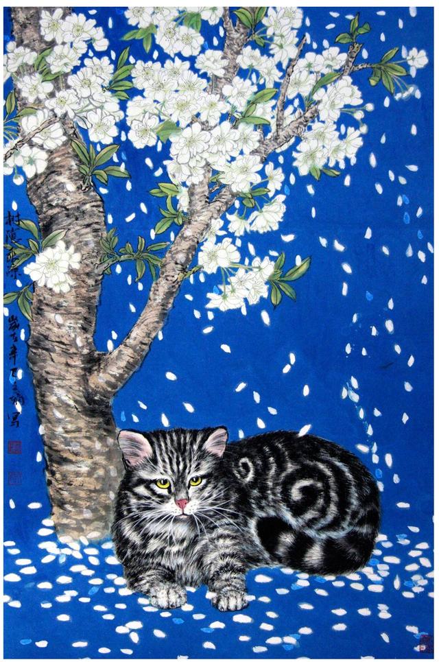 (这幅《梨花雨》师法与原莱阳梨树,在创作中特加了一条小河,增加诗情画意尔。)